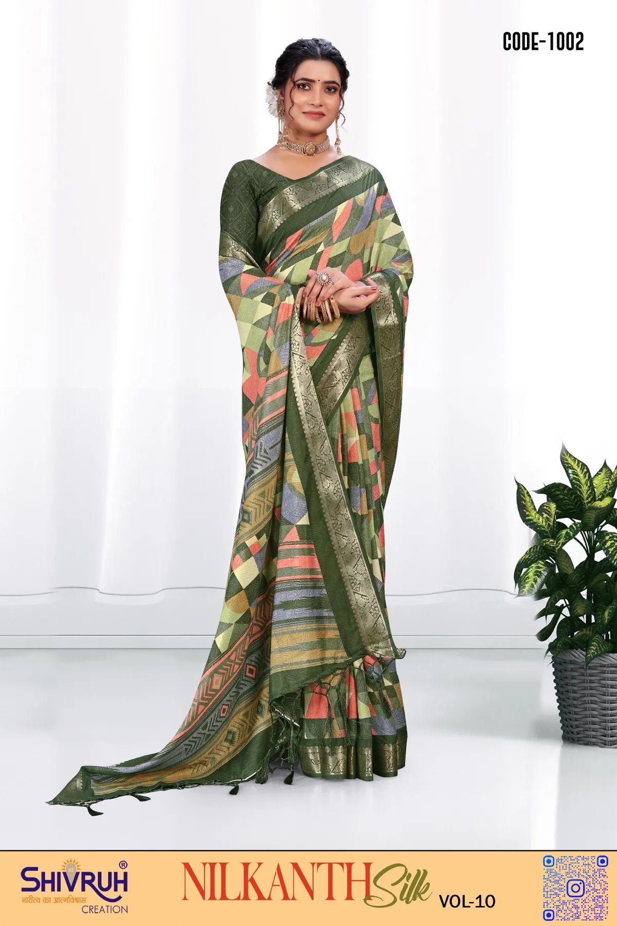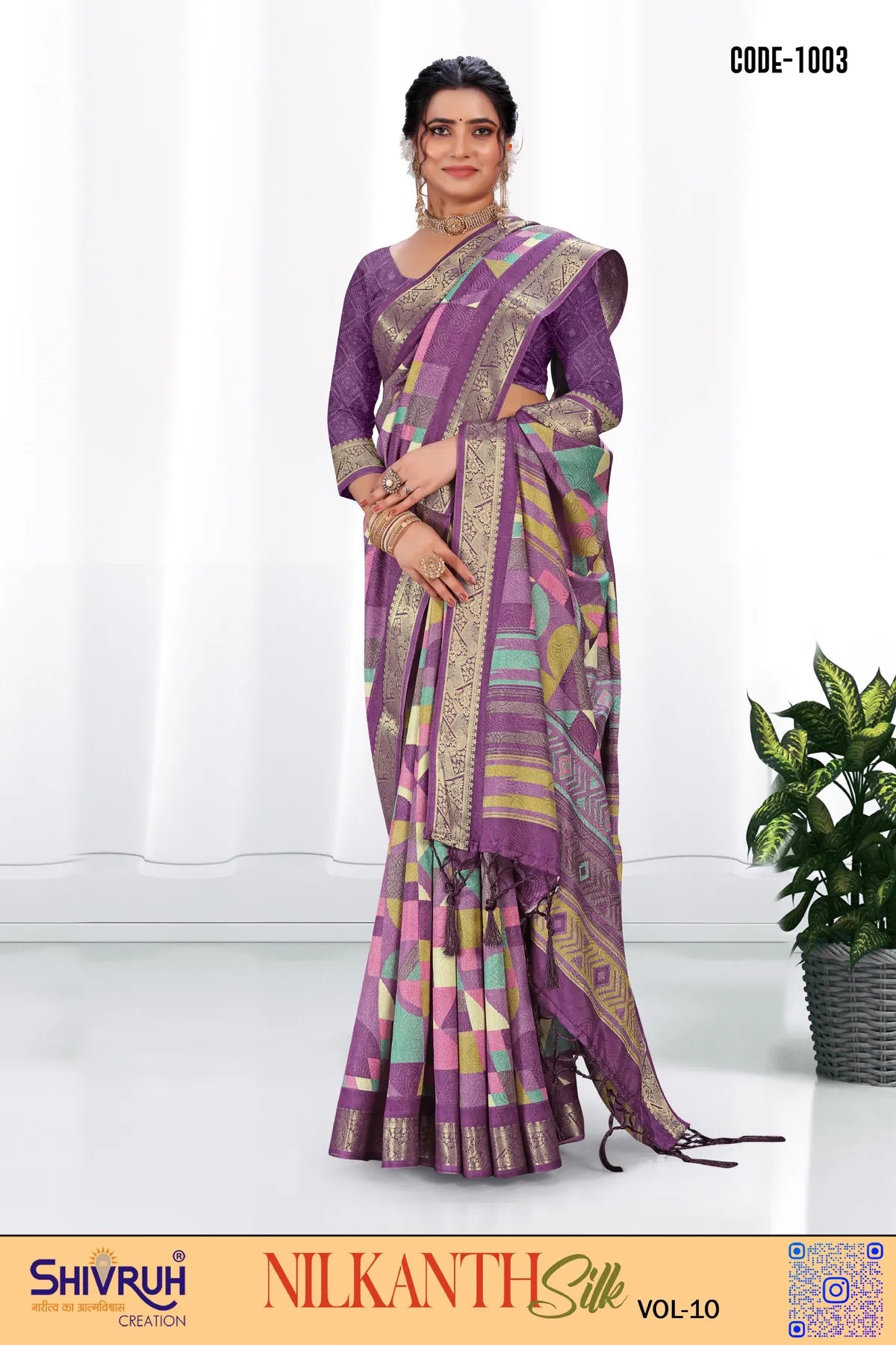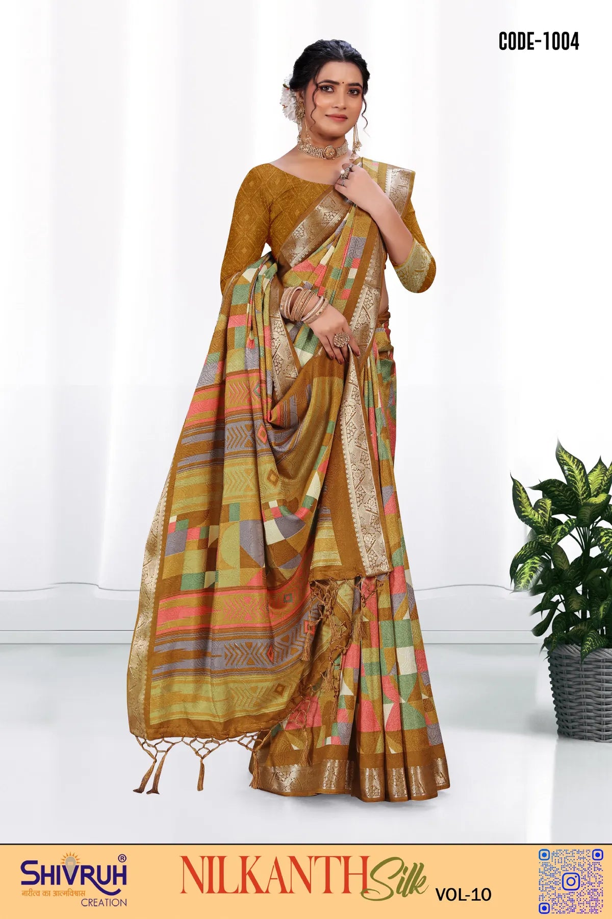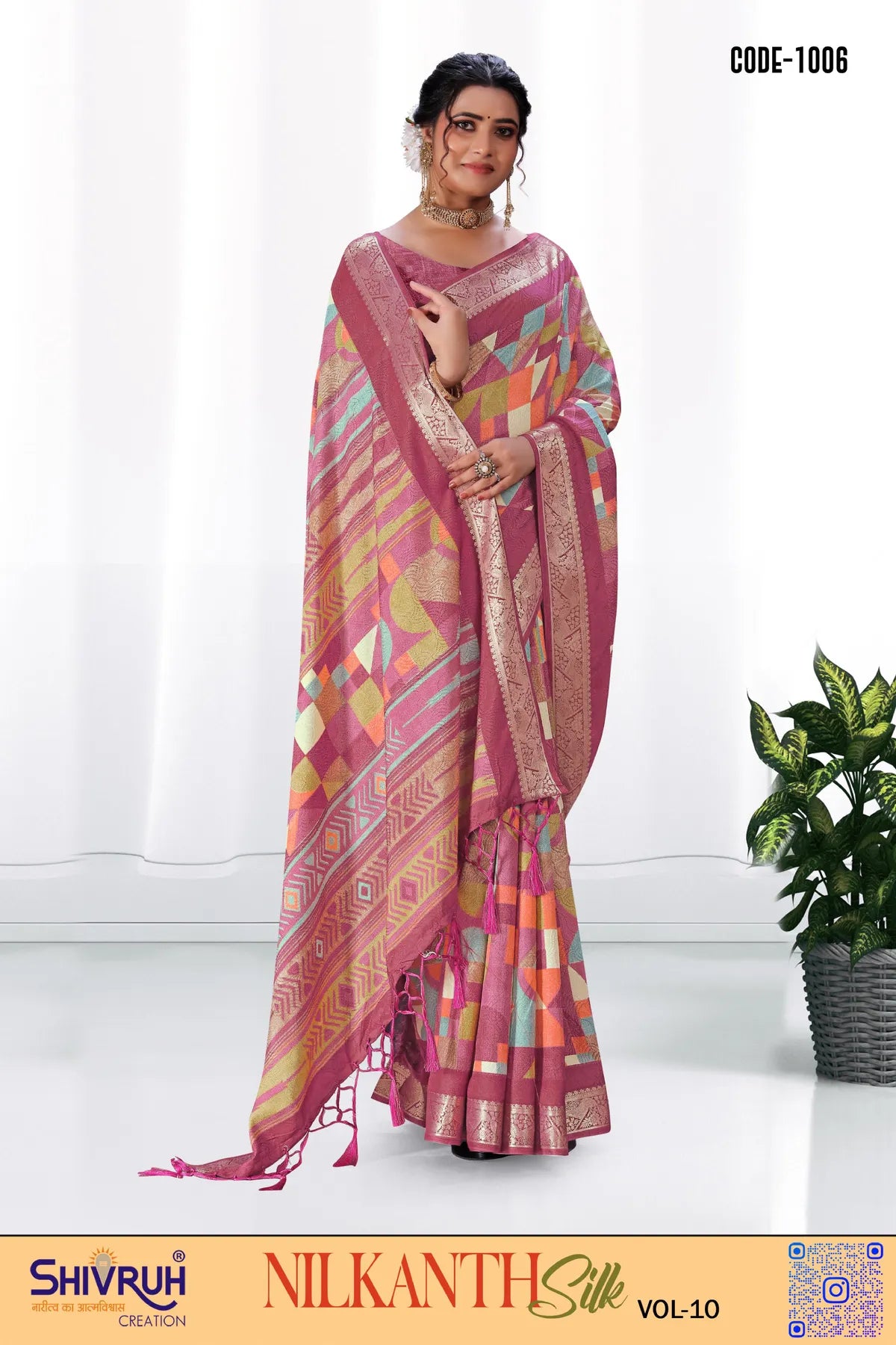 Elevate your ethnic wardrobe with our exquisite SHIVRUH Dola Silk Saree with a stunning geometric printed design. This premium saree comes with a matching blouse featuring intricate Jhalar detailing, perfect for high-class, sophisticated women. The exclusive Jacquard border adds a touch of luxury to this wedding or party wear saree look. Feel elegant and stylish in this hi-quality material saree designed for the modern woman.