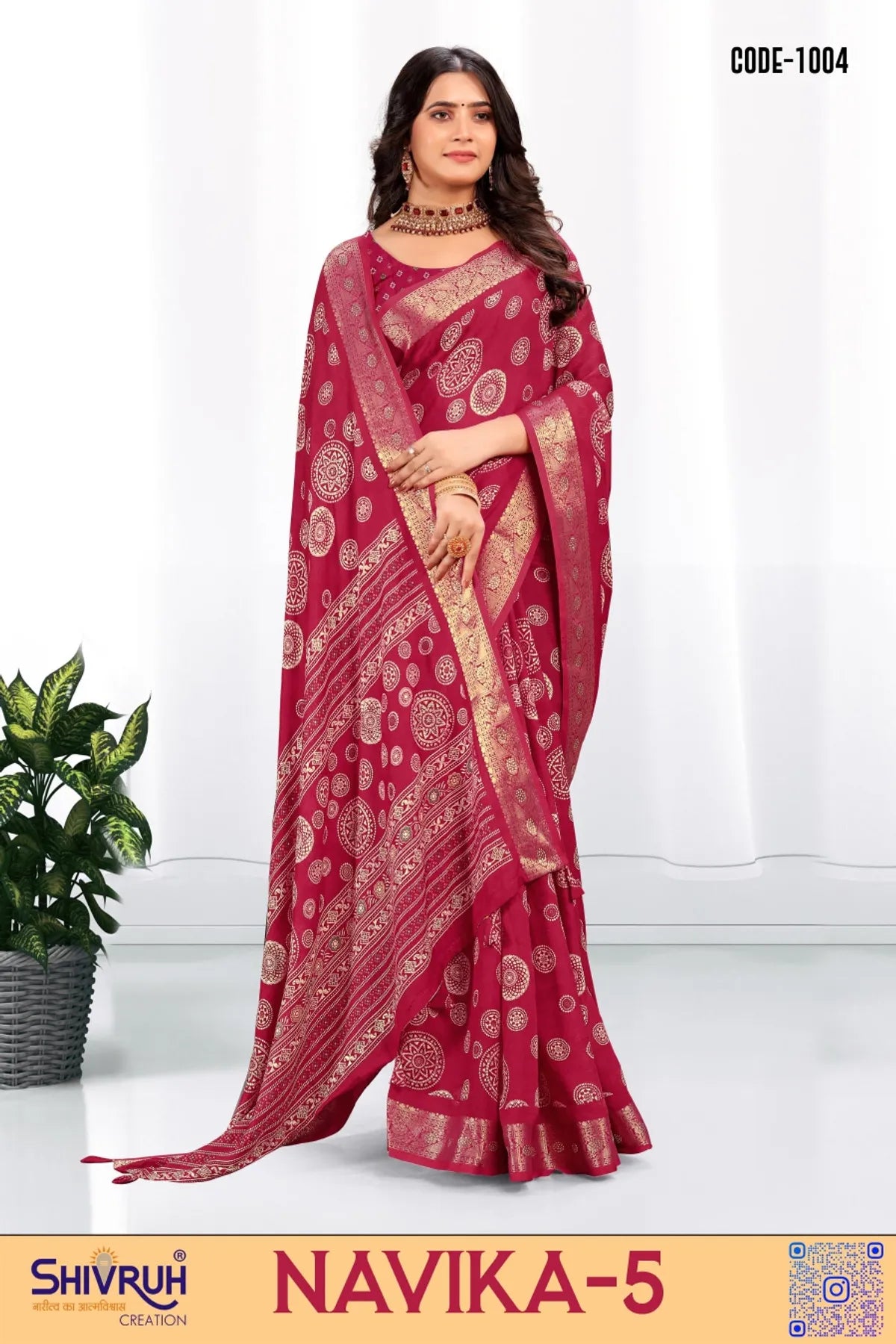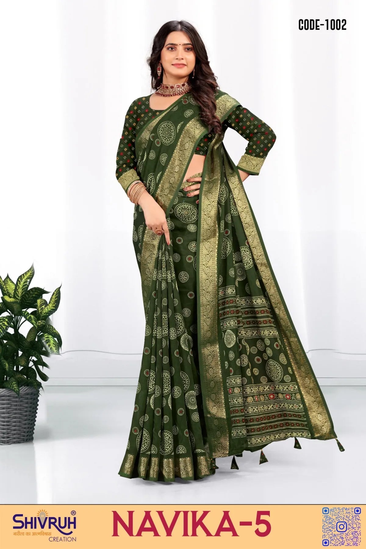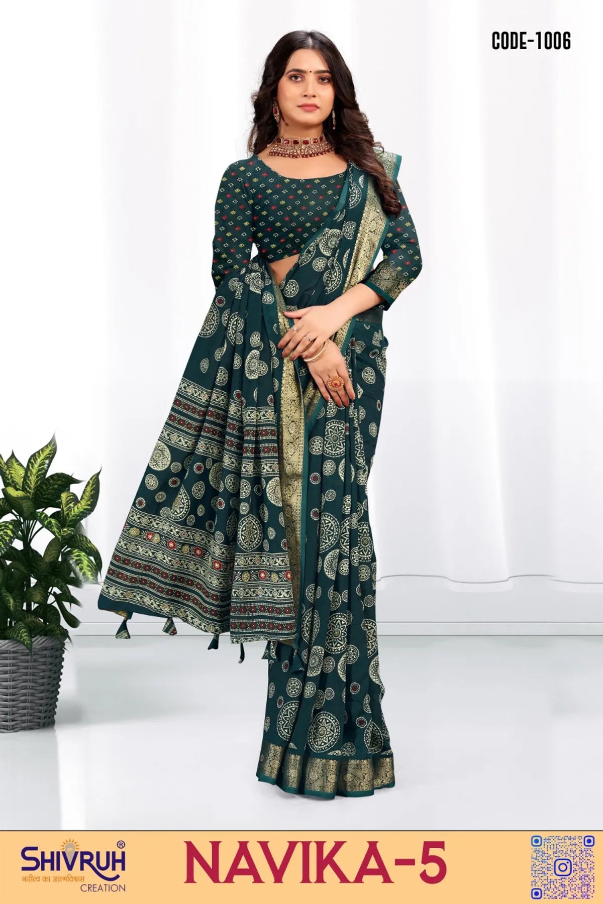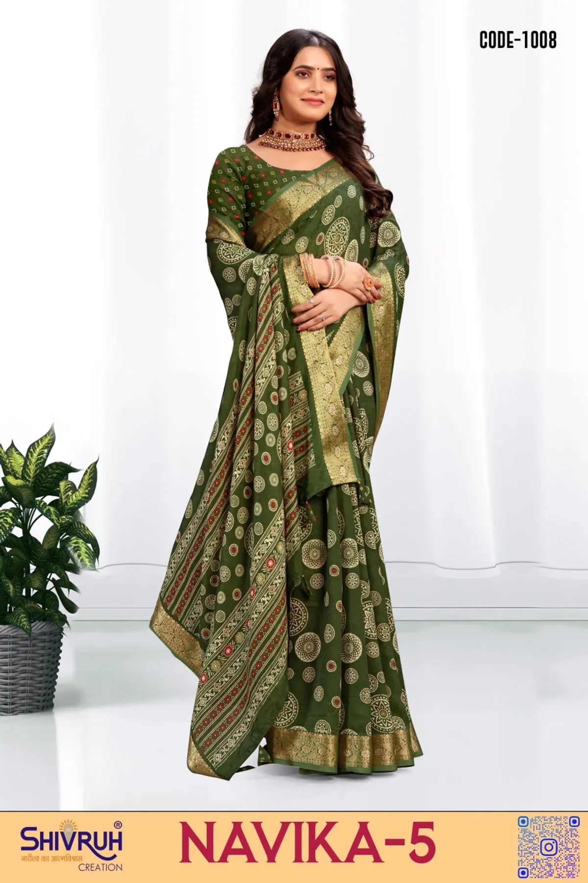 Introducing the new Moss Chiffon Saree from SHIVRUH brand, featuring a stunning Circular Motif Print design. This premium saree with matching blouse is perfect for high class, sophisticated women who want to make a statement at weddings and parties. The exquisite Jacquard border adds an extra touch of elegance to this must-have saree dress for the season.