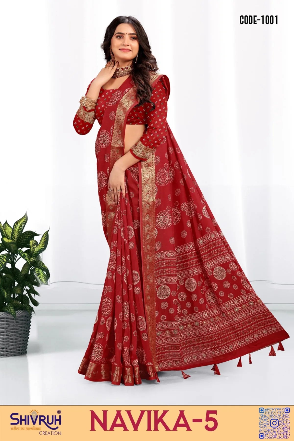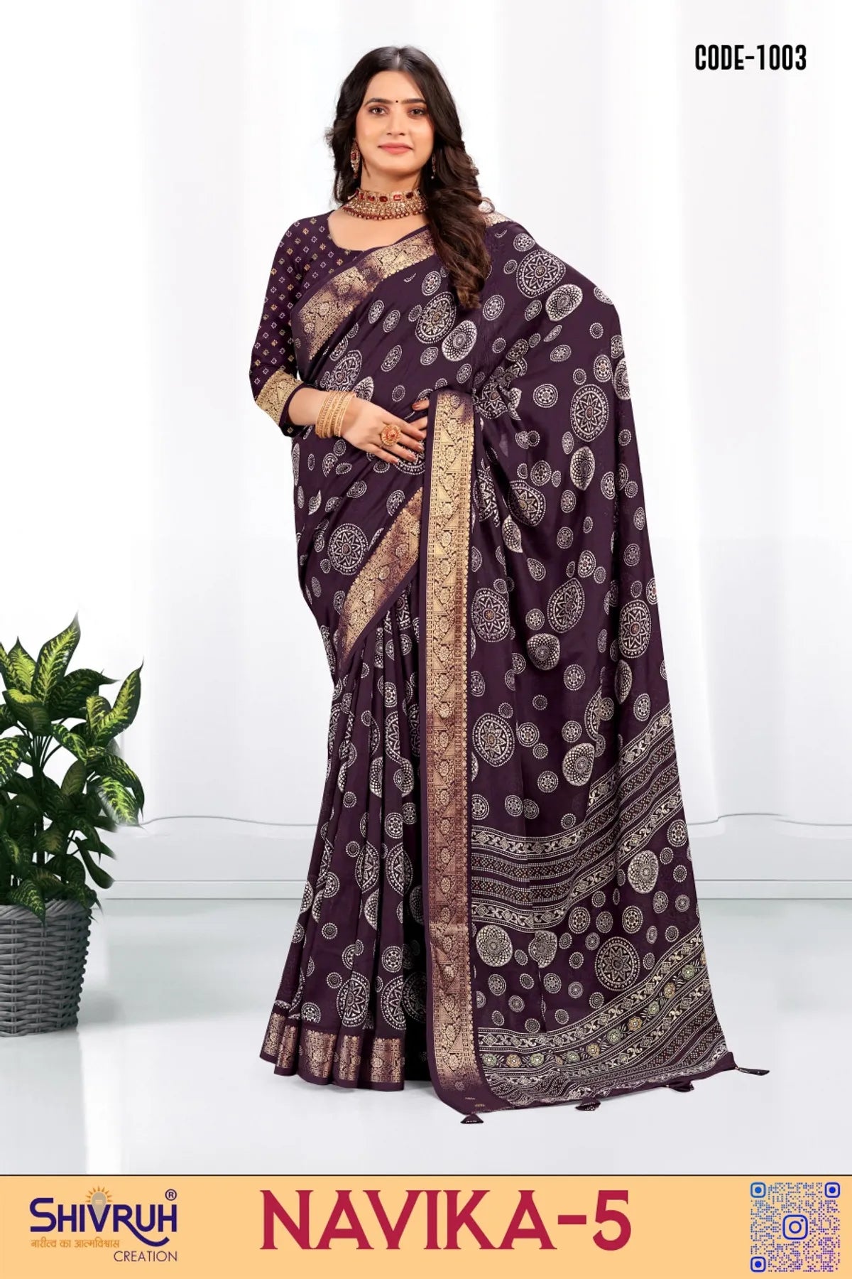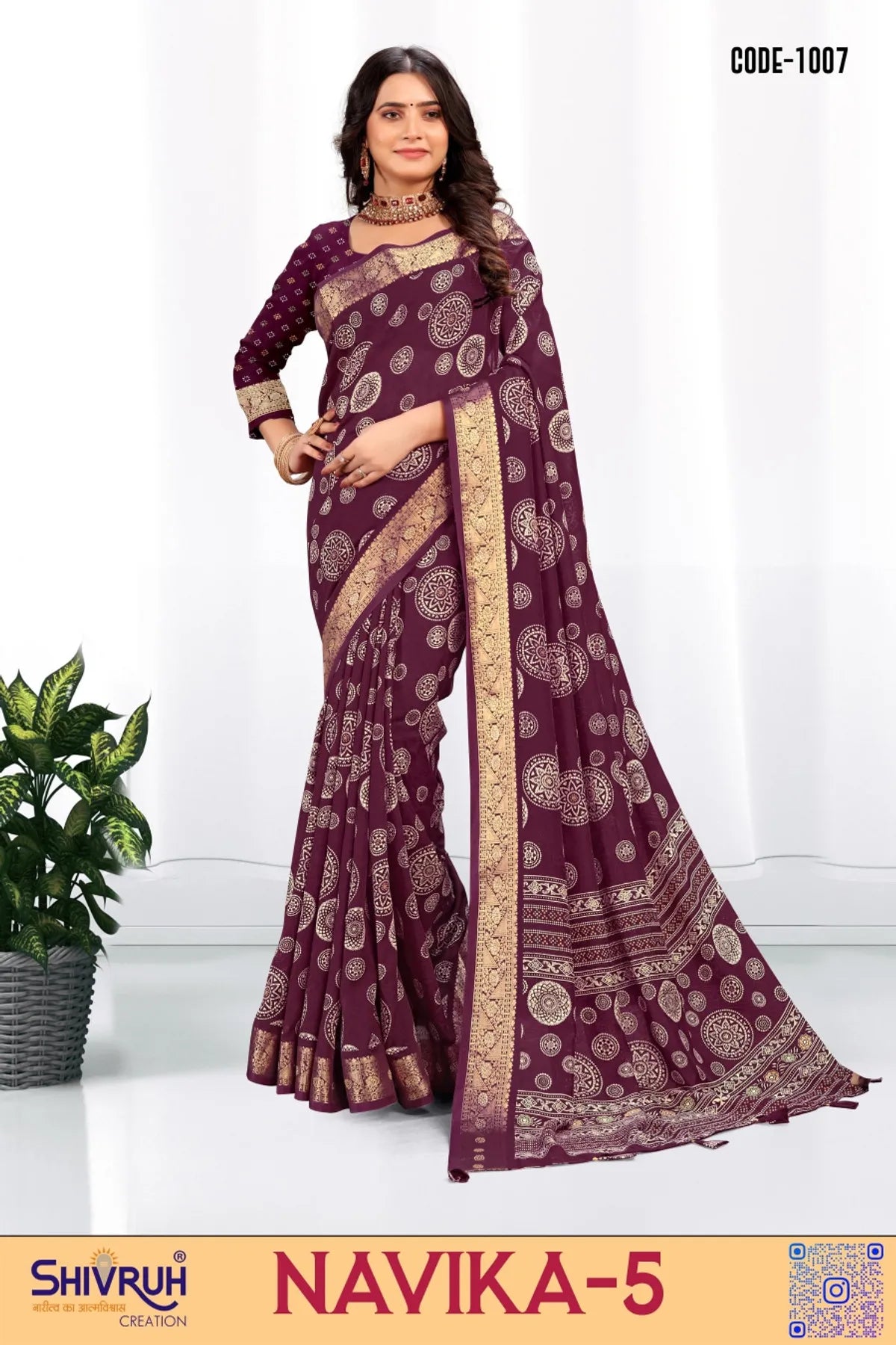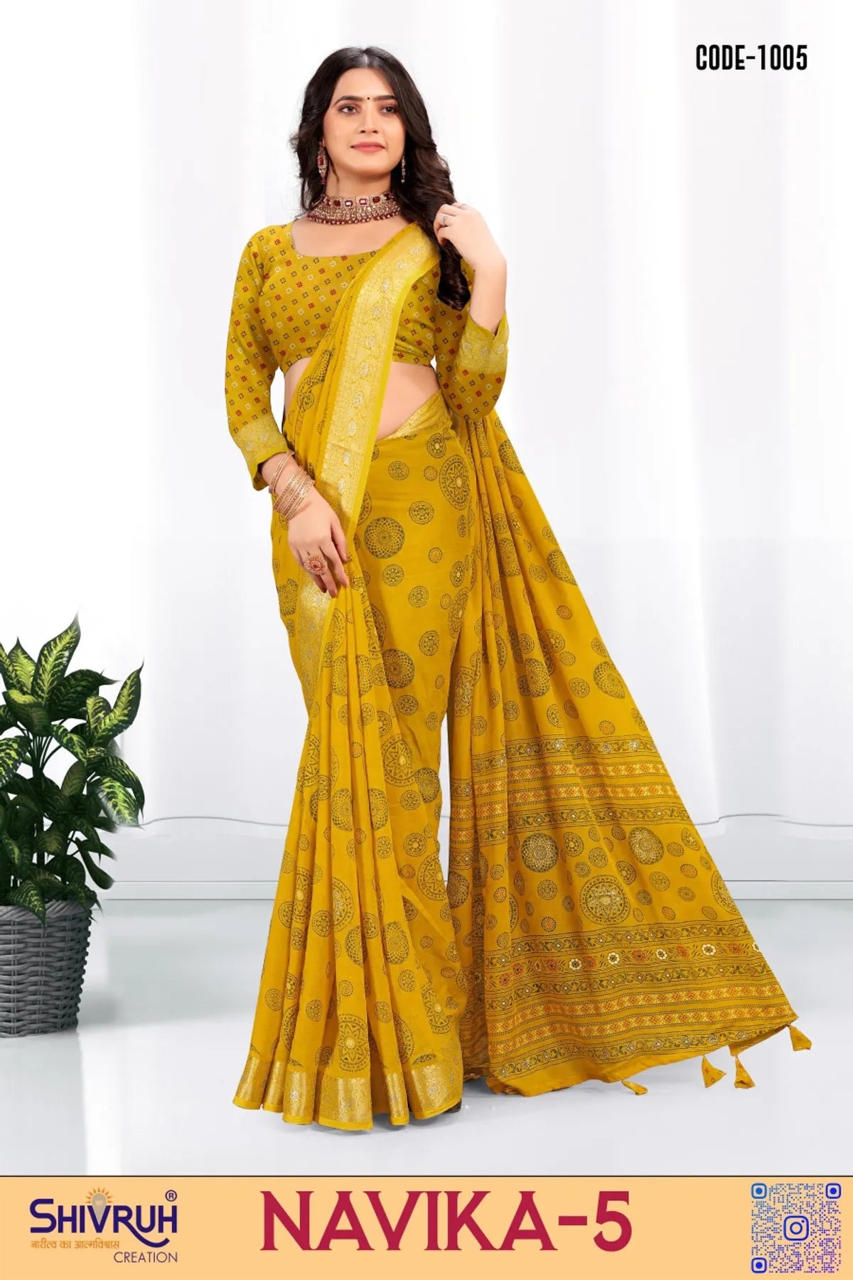 Introducing the new Moss Chiffon Saree from SHIVRUH brand, featuring a stunning Circular Motif Print design. This premium saree with matching blouse is perfect for high class, sophisticated women who want to make a statement at weddings and parties. The exquisite Jacquard border adds an extra touch of elegance to this must-have saree dress for the season.
