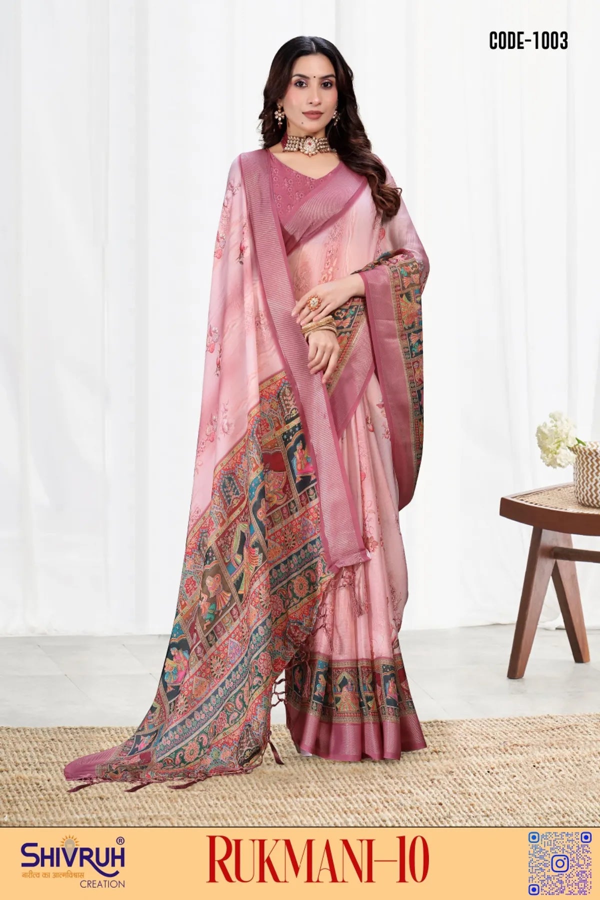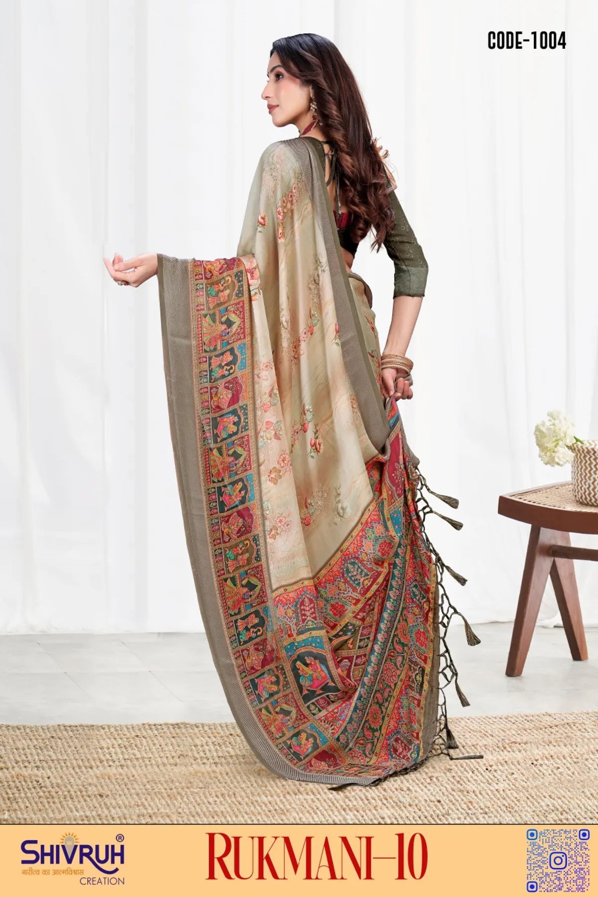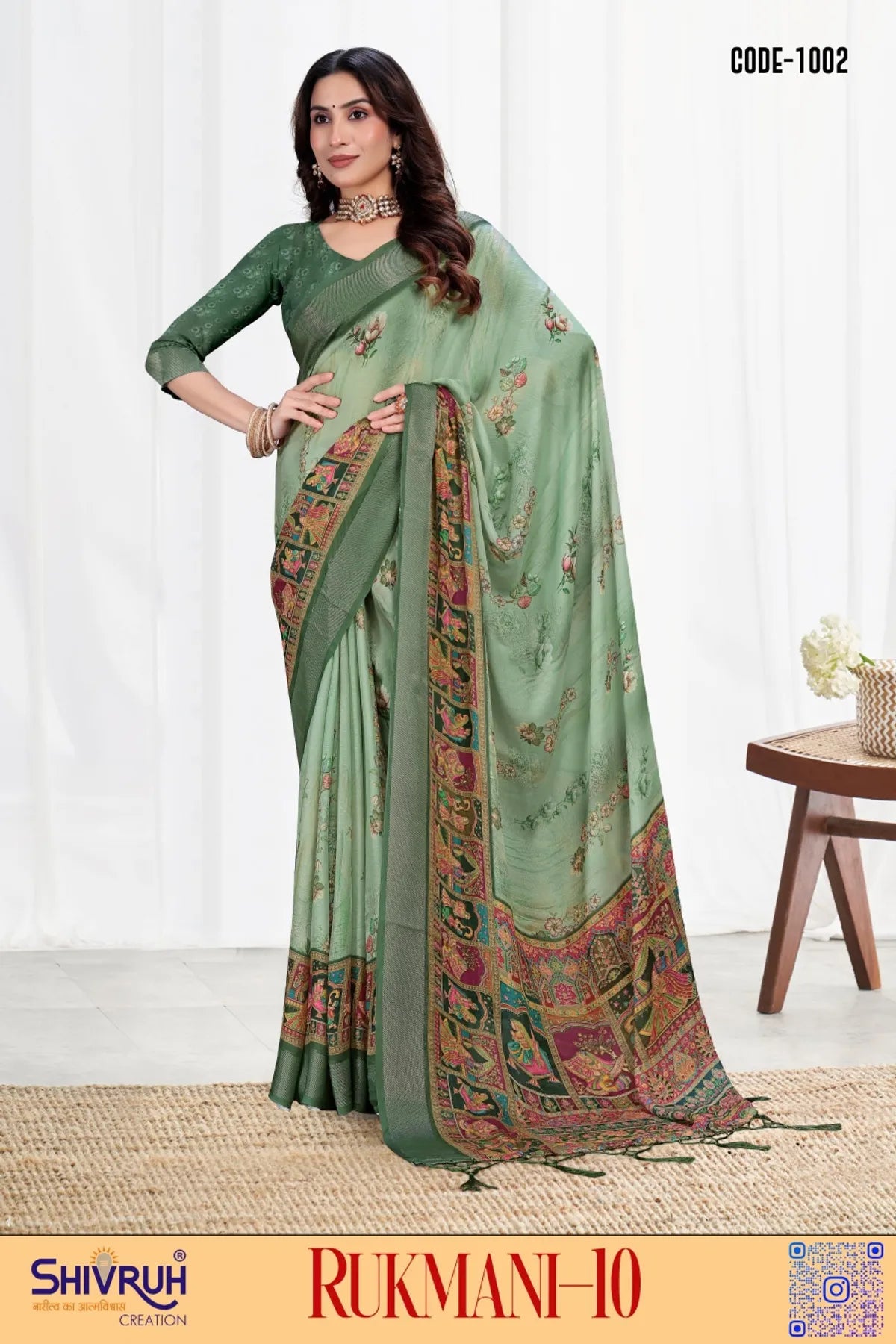 Step into luxury and elegance with our SHIVRUH brand new Moss Chiffon Saree with Digital Print design. This premium saree and blouse set exudes sophistication and style, perfect for high class, rich women who appreciate fine craftsmanship. The exquisite Jhalar detailing adds a touch of glamour to this exclusive saree, making it a standout piece for any special occasion. Elevate your wedding saree or party wear saree look with this stunning ensemble.