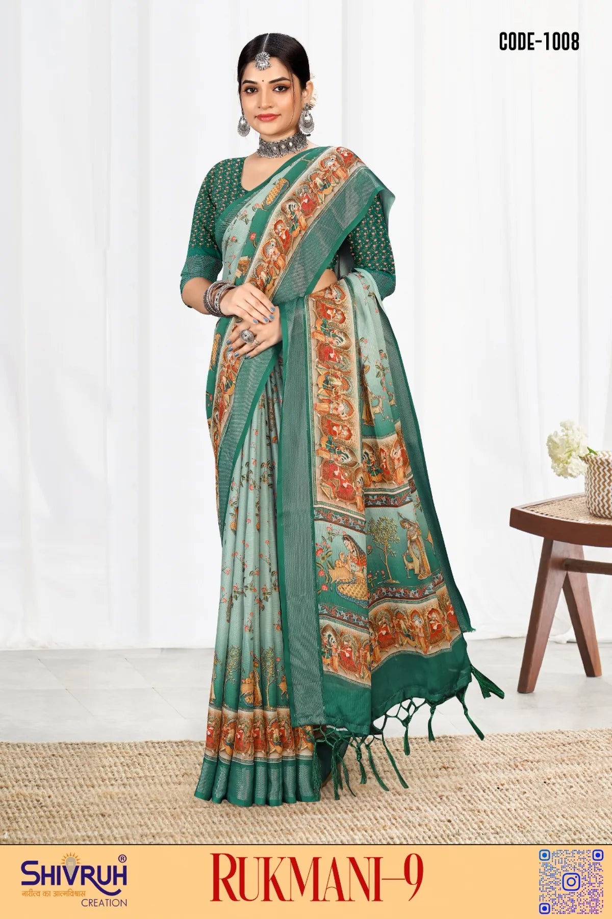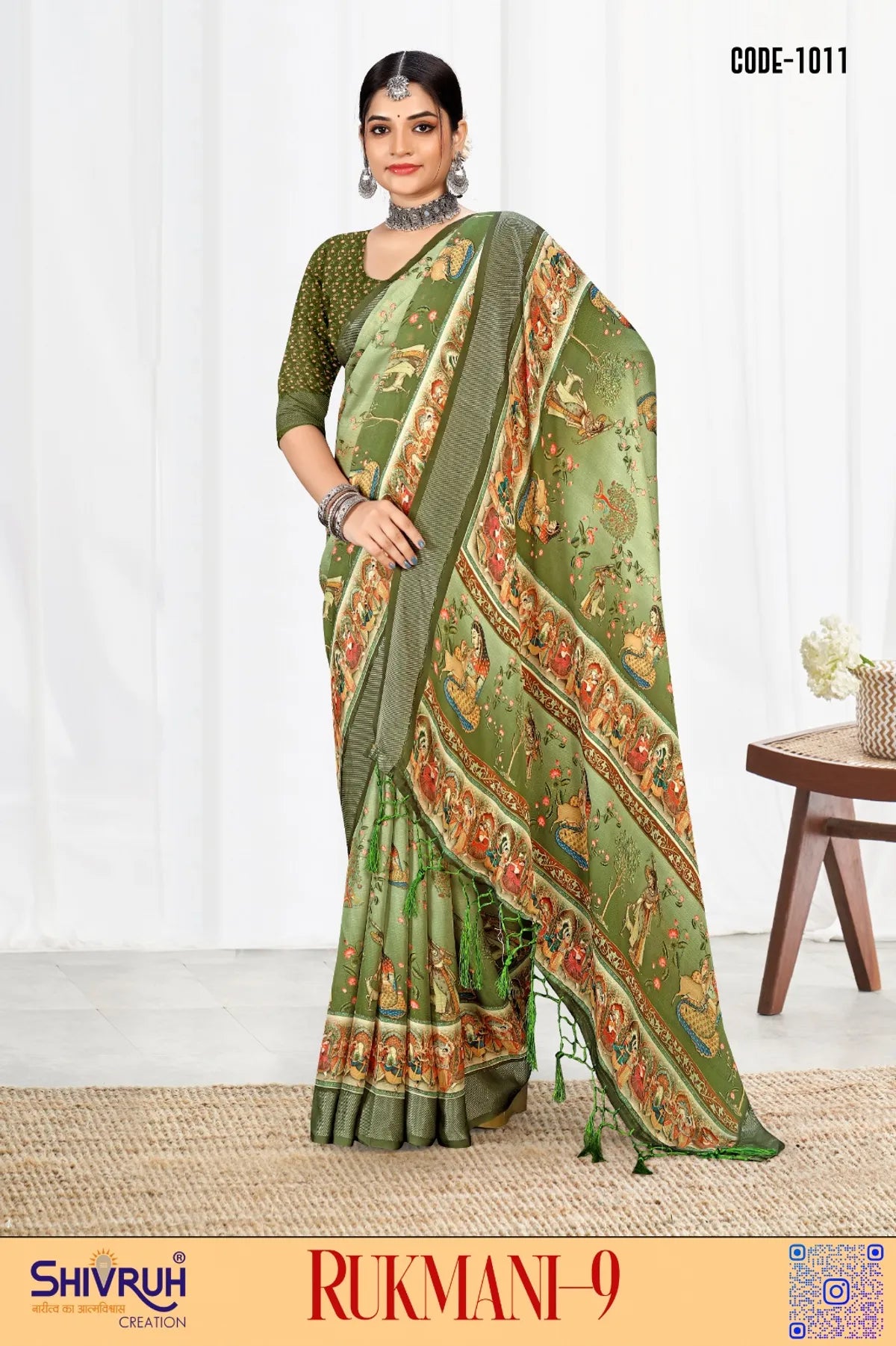 Introducing the latest addition to our SHIVRUH brand collection - the new Moss Chiffon Saree with Digital Print design. Made with premium quality materials, this saree is perfect for high class, rich women who want to make a statement at any event. The saree and blouse set come with a beautiful Jhalar detail, adding a touch of elegance to your look. The exclusive Woven Jari border adds a luxurious touch to this already stunning piece.
