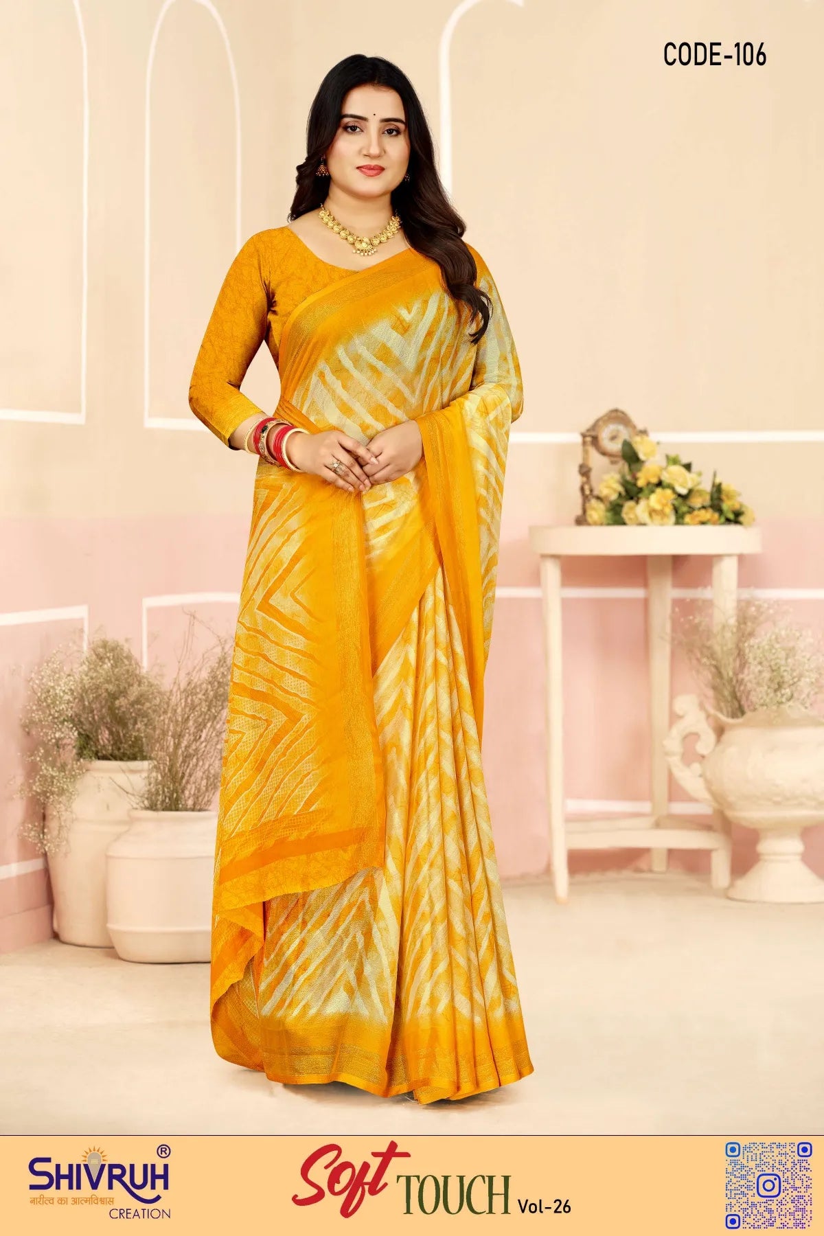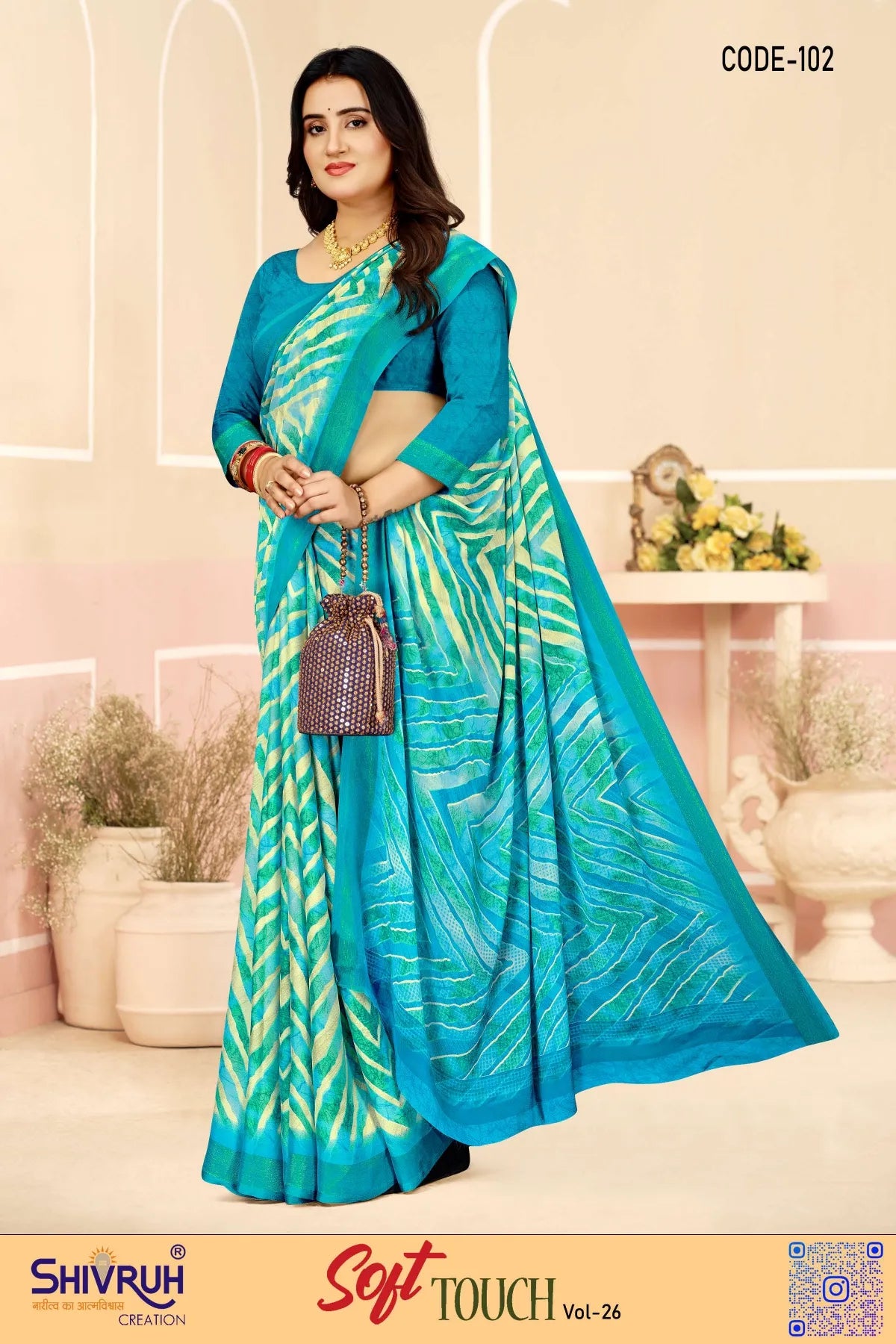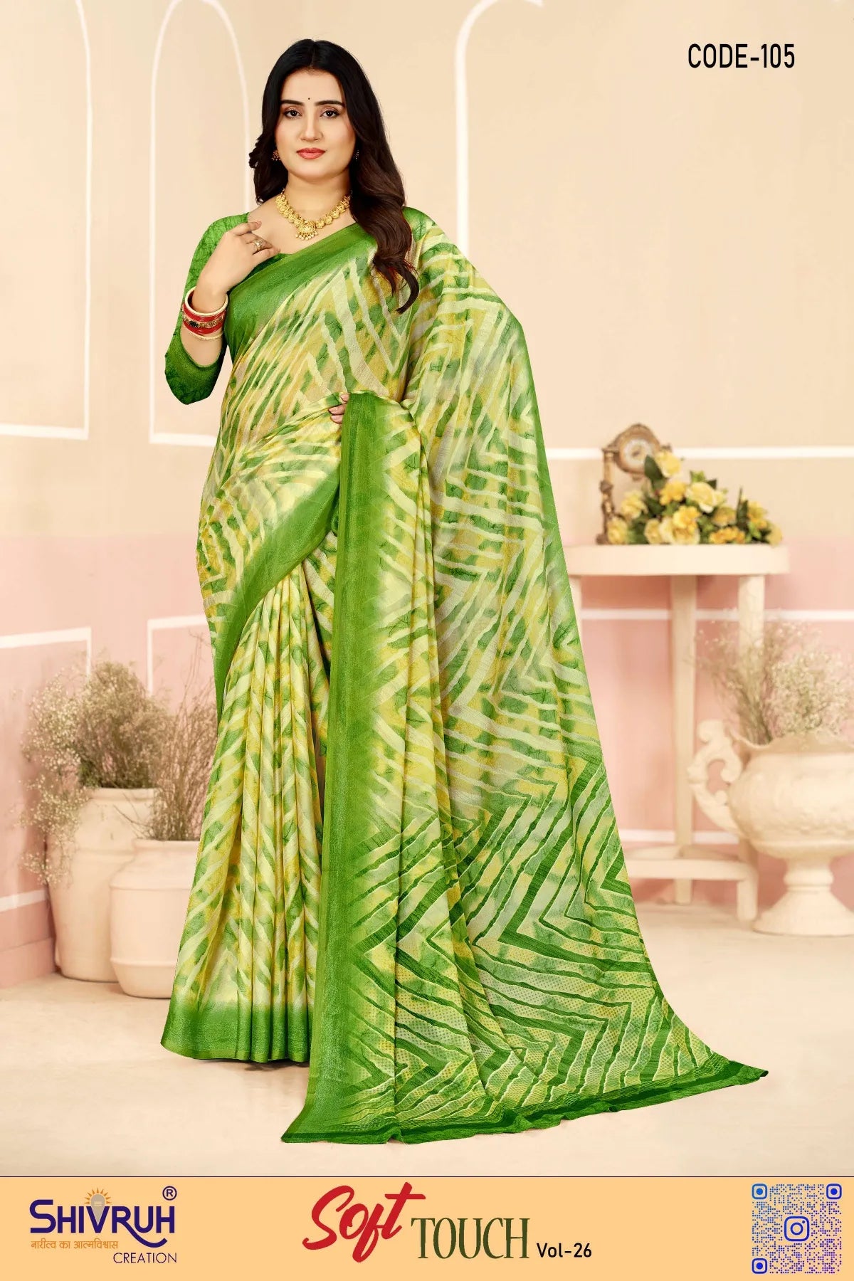 Introducing the latest addition to our SHIVRUH brand collection - the exquisite Moss Chiffon Saree with Laheriya design Printed work. This premium saree and blouse set is perfect for high-class, elite women who appreciate quality and style. The Woven Jari border adds a touch of sophistication, making it ideal for weddings, parties, or any special occasion. Elevate your saree dress look with this elegant piece crafted from the finest materials.