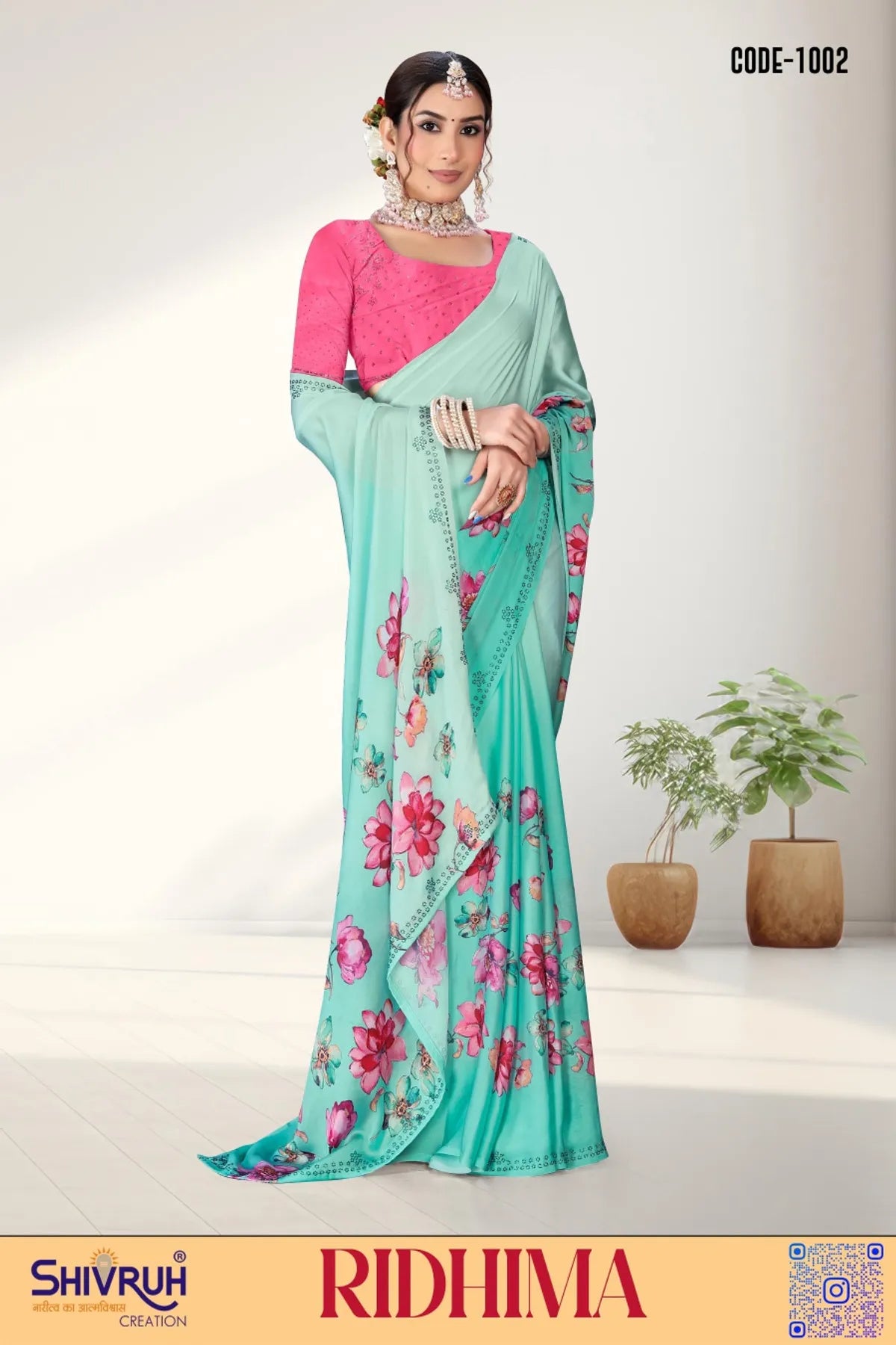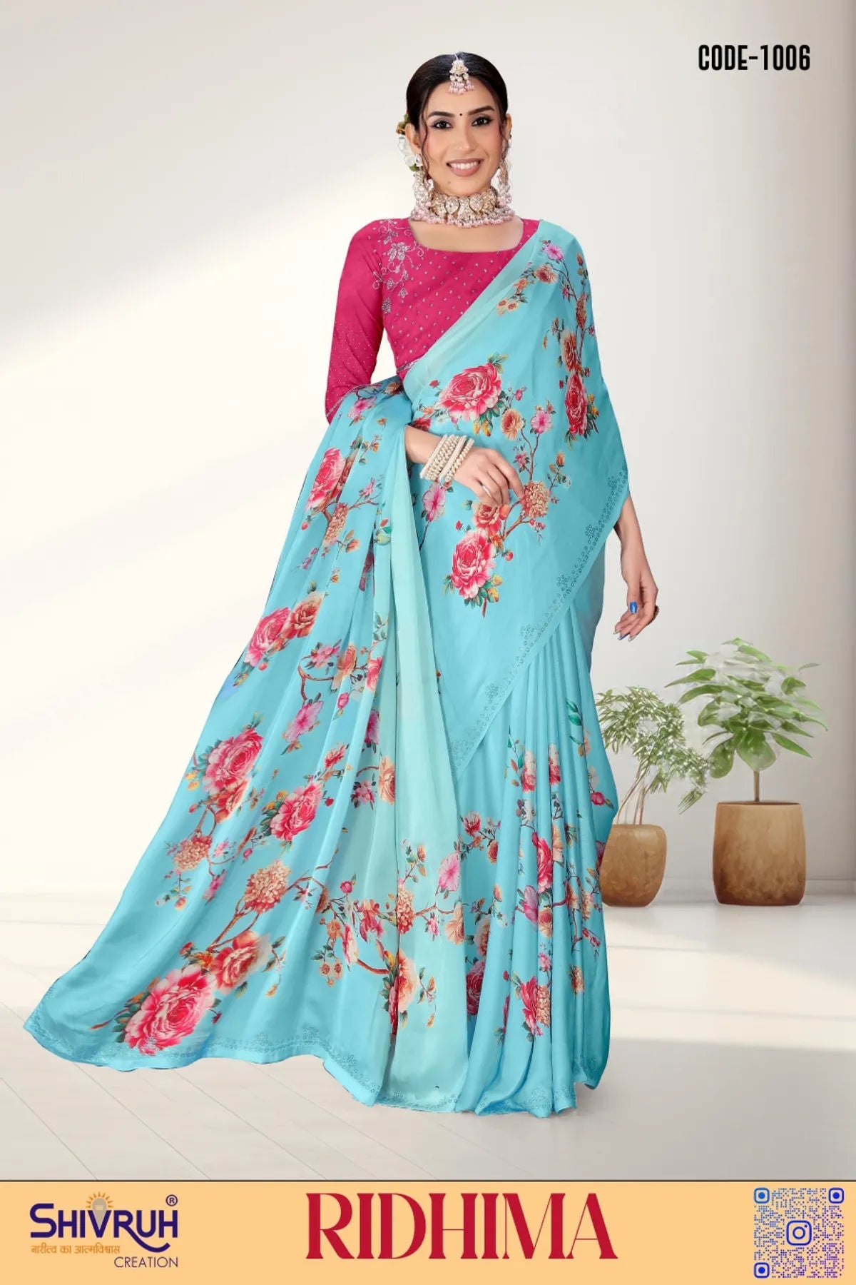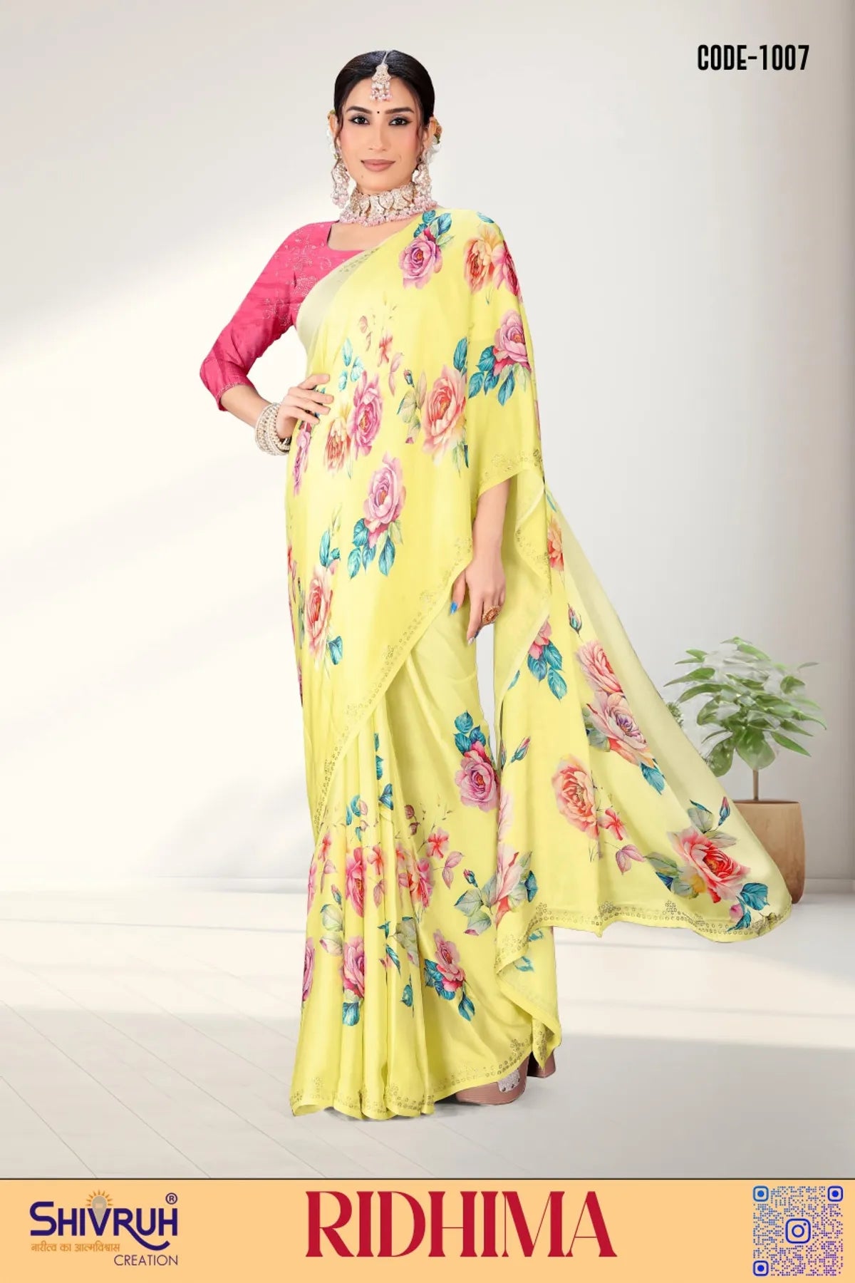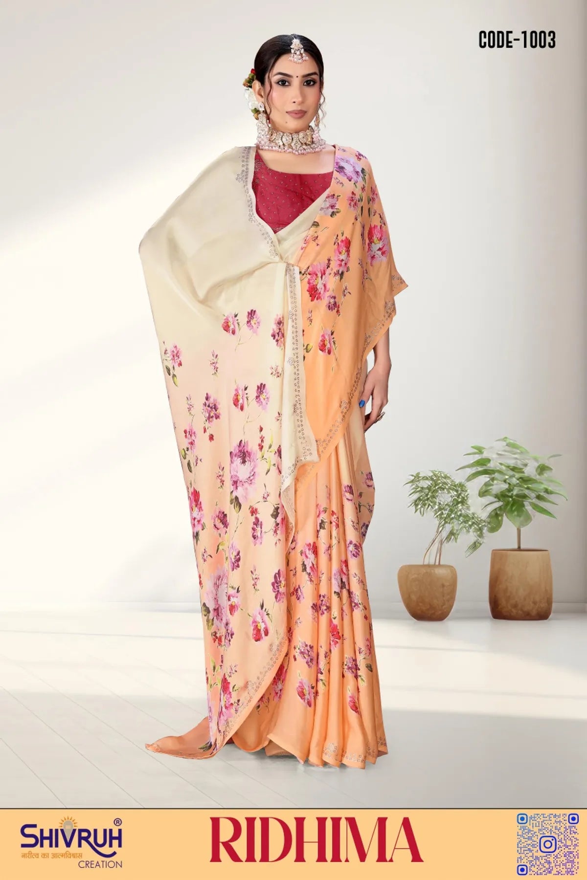 Elevate your ethnic wardrobe with this exquisite Women's Satin Saree from SHIVRUH. This fancy saree features a beautiful floral print and Swarovski border, perfect for any special occasion. Dress to impress in this stunning piece that effortlessly combines traditional elegance with modern style.