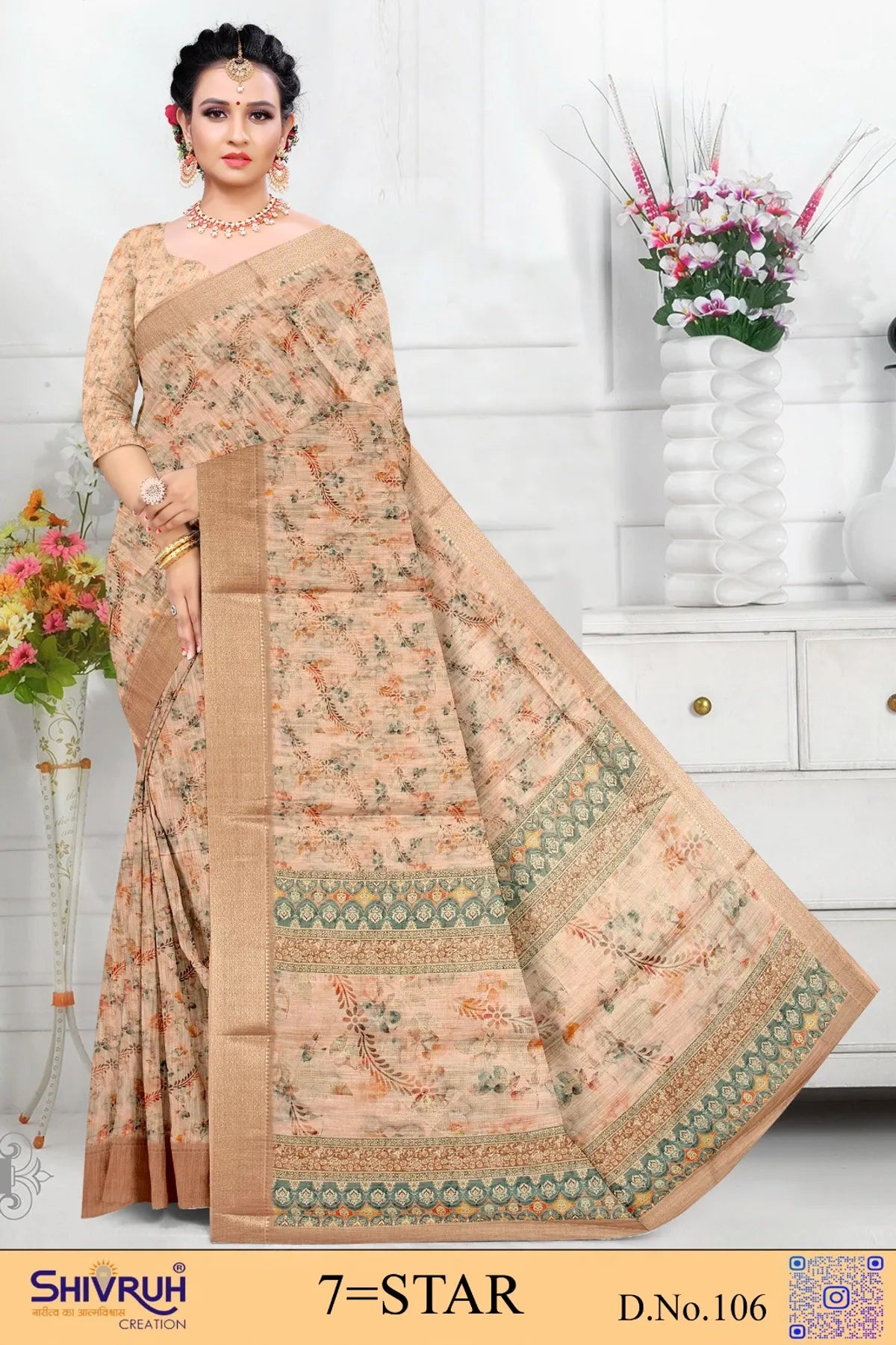 Upgrade your style with our Cotton fabric Digital Print Pattern Jacquard Border saree for women. Made from premium quality cotton, this saree features a stunning digital print pattern and detailed jacquard border. Ideal for all events, it enhances your wardrobe with a trendy touch. The Premium Party Saree by Shivruh is a luxurious creation designed to make you stand out at any special event. It is a fine balance between traditional craftsmanship and contemporary fashion, making it the ultimate choice for women who wish to celebrate their elegance and beauty on festive occasions. Shivruh, known for its commitment to quality and style, has crafted this saree to bring together opulence and comfort, creating a timeless piece for the modern woman.